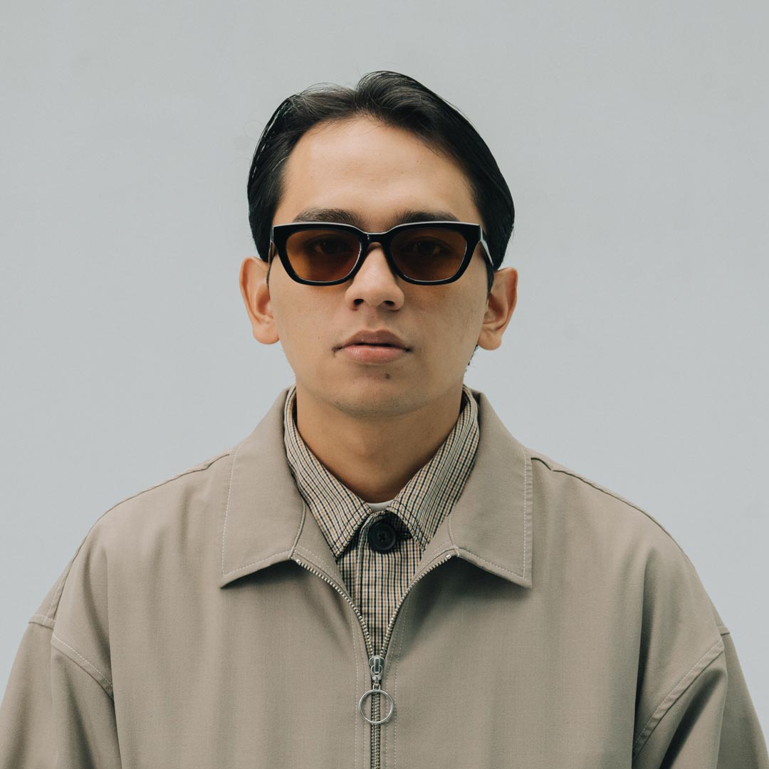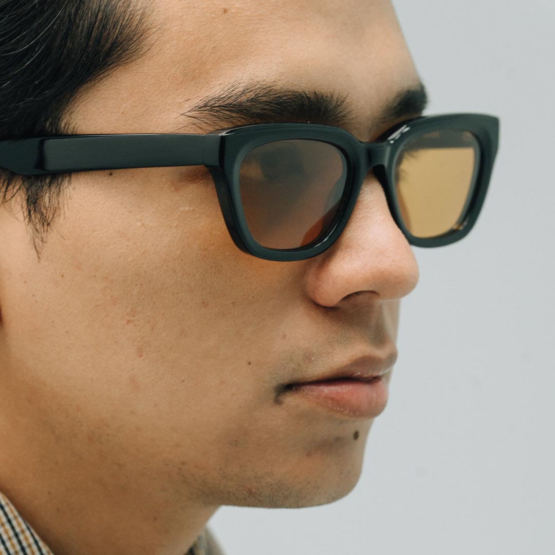 Base is designed as a compact, with a thick brow-line. Chiselled acetate rims are shaped for lightness in everyday use, while adding an architectural quality to the frame.